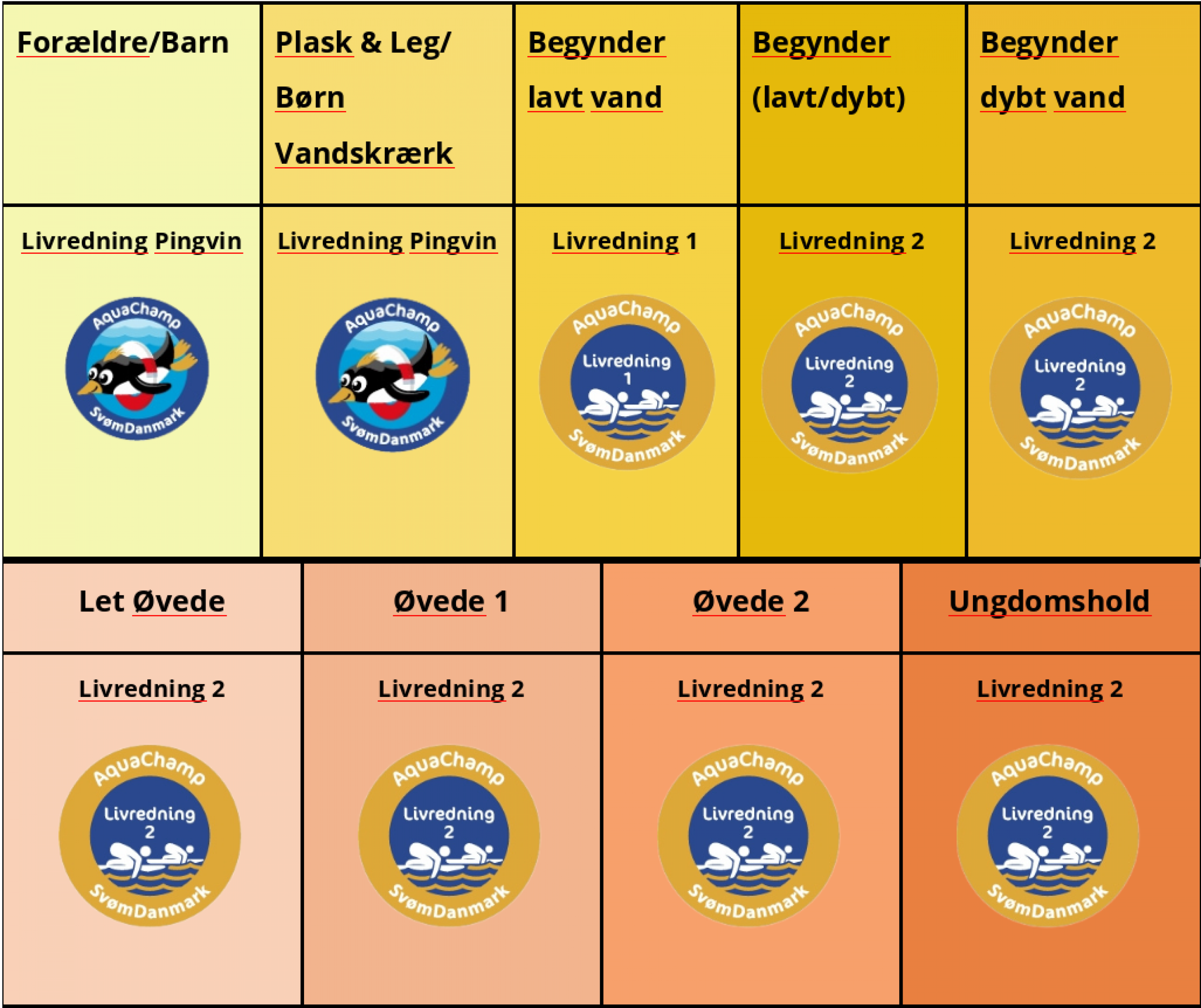 | 3 | Vandtilvænning med fokus på at puste ud under vand og dyppe kropsdele under vandet. | Vandtilvænning og svømme på ryggen med fokus på at være i vandet på ryggen og kropspositionen. | Rygcrawl & flyde m. vending med fokus på teknikken særligt i armtaget. Derudover øves det at vende fra maven til ryggen, mens svømmeren flyder. |